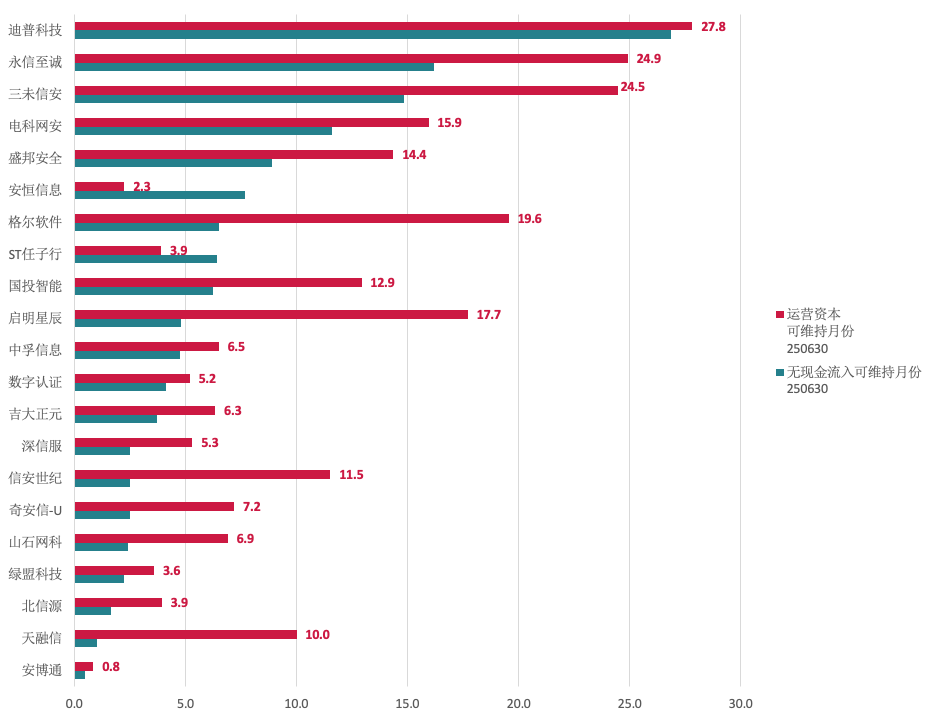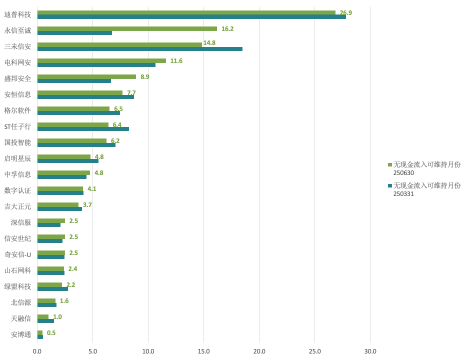 具体公司里,迪普科技继续以 26.9 个月排名第一,永信至诚和三未信安分列二三位,分别为 16.2 个月和 14.8 个月。从边际变化看,有 10 家公司的现金状况在二季度有所改善,也就是它们在 2025 年 6 月底的“无现金流入可维持月份”比一季度末更长。