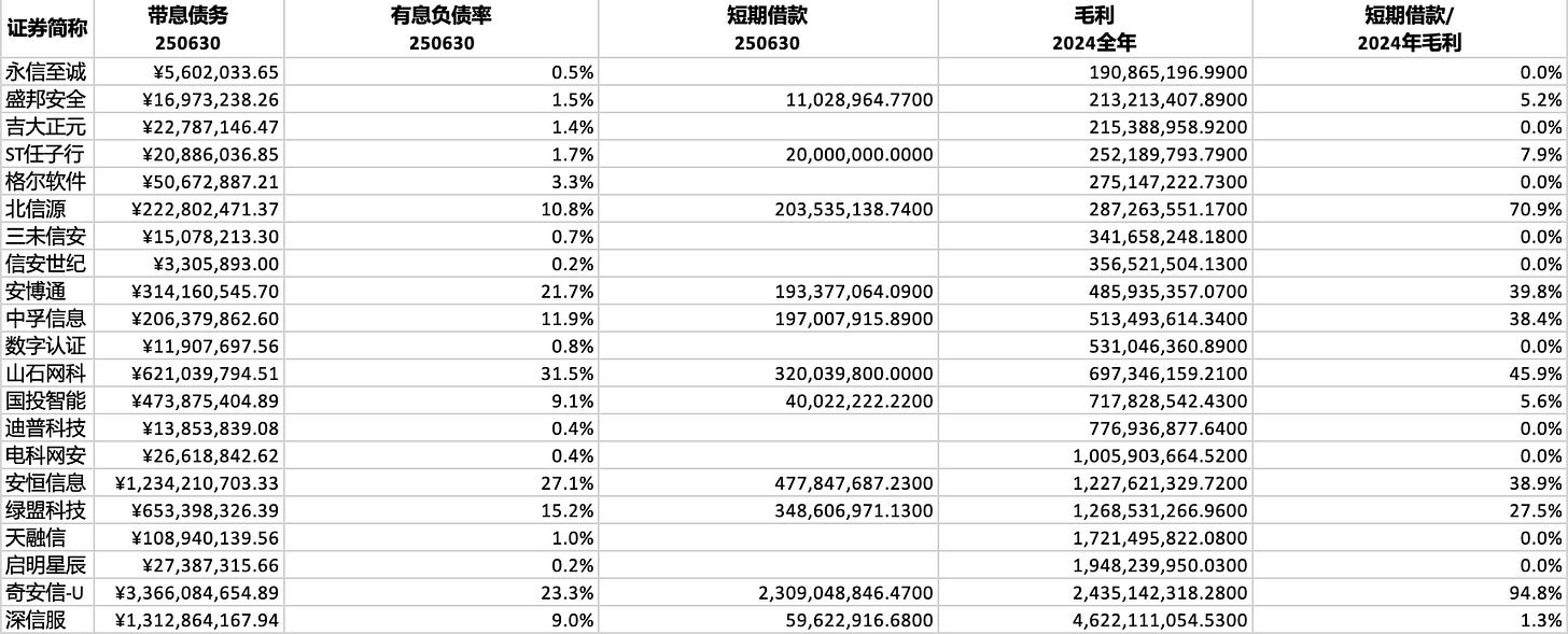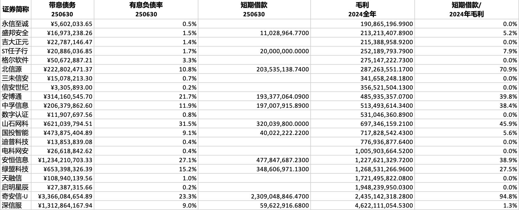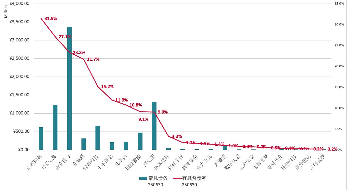 截至 2025 年 6 月底,21 家公司的中位有息负债率为 1.7%,也就是说,超过一半的公司几乎没有债务。山石网科、安恒信息、奇安信和安博通的负债率相对更高。
