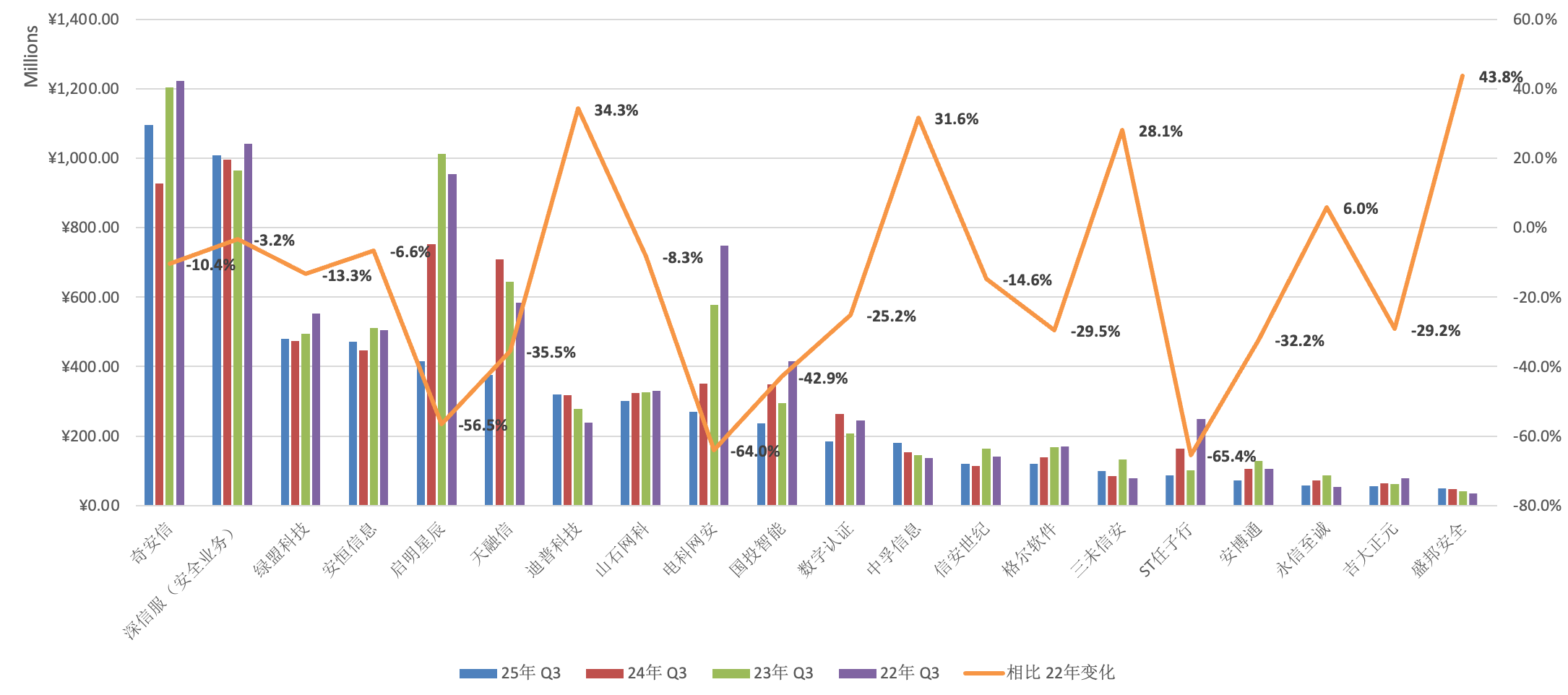 2025 年第三季度,20 家网络安全上市公司合计营业收入为 71.1 亿元人民币,较 2024 年同期的 77.9 亿元下降 8.7%,降幅相比上季度的-7.1% 继续扩大。