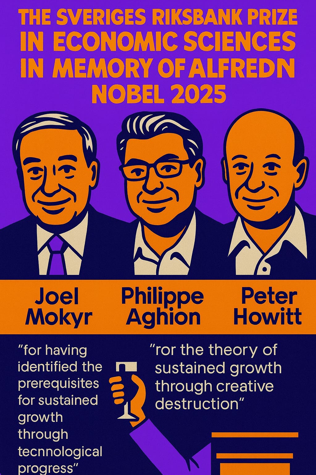 2025 年的诺贝尔经济学奖授予了乔尔·莫克尔(Joel Mokyr)、菲利普·阿吉翁(Philippe Aghion)和彼得·霍威特(Peter Howitt),表彰他们“对创新驱动经济增长的解释”。