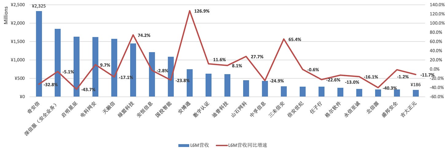 值得注意的是,在过去半年中,收入体量前八的网络安全上市企业中,仅有电科网安和绿盟科技两家公司实现了收入的增长。而收入体量前八的企业合计收入同比下降了 16.1%,降幅高于 21 家网络安全企业合计收入同比下降的 11.0%。这表明,在市场收缩期,头部企业的市场集中度正在下降。